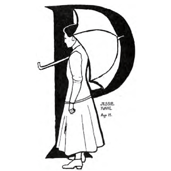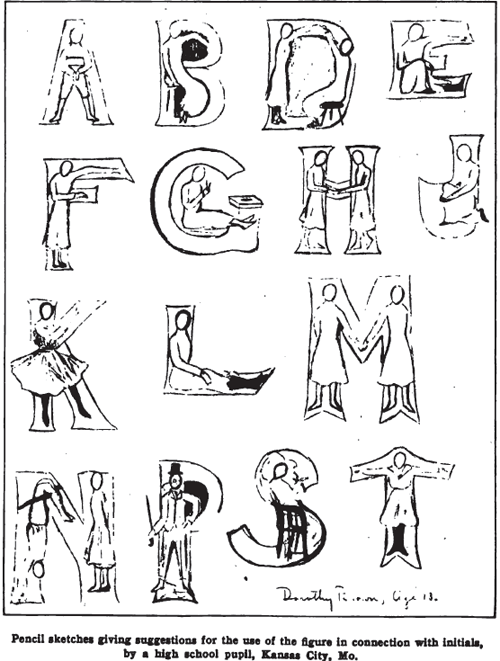 Drawing people in the poses of Alphabet letters sounds very much like a game…but since it works, why not mention why it works so well… First, it helps astonishingly, in many cases, with proportions. The child, looking at the model, sees the letter, rather than a human being, and, in that simplified form, the big proportions present themselves to him in a much less bewildering and complicated form. Second, in such letters as the R and the S, it helps with the action; gives, unconsciously, the key to the great “direction of line” of the figure. Unquestionably it gives the “big form,” in a simple and easily understood manner. Last, and most important, it suddenly illuminates, for the student, the meaning of “simplicity,” and one of the reasons for it. If they are sketching Edith, for instance, why isn’t it of vital importance to put in the things that pertain to Edith—the obvious facts that she has eyes, nose, and mouth; that her hair is curled, or straight; that her sleeve has an anchor embroidered on it, her skirt is pleated just so, and her shoes are buttoned? To the mind of the 13-year-old, these are facts of much importance. They impress themselves upon him much more forcibly than does the exact size of the head in relation to the body, or the articulation of arm and hand, or the length of the foot. The child sees that embroidered anchor and the buttoned boots definitely and clearly, and, even after he has measured six times, and looked an hour, he is still a bit uncertain as to the anatomy and proportions. So, if he is sketching “Edith,” he puts in those things that, for him, identify “Edith.” Matters are different, tho, if he is sketching an initial letter. He is at once apt to leaving out many of those “dear details.” He feels that the grace of the big lines, the relation of the parts, and the omission of all detail are necessary from a decorative standpoint, and doubly so, if it is his intention to some day use the initial, much reduced.