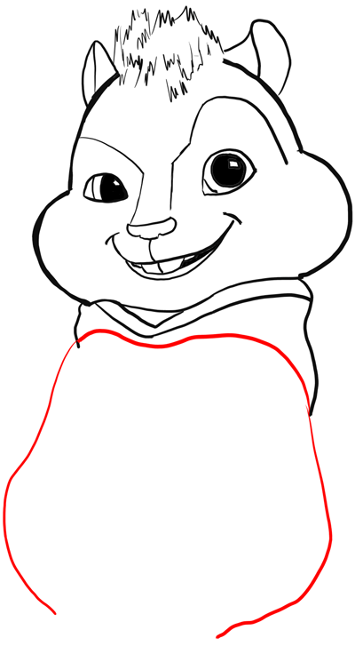 Now draw another curved line and then draw a bunch of straight lines down for the bottom of Alvin’s sweatshirt. Also draw a sideways ‘c’ like shape for Alvin’s t-shirt, which is under the sweatshirt.