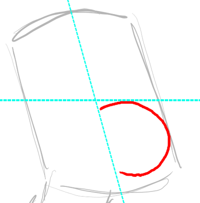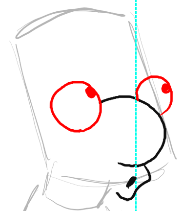 Now draw Millhouse’s eyes on either side of the nose. I drew a blue guideline to show you that the right eye starts at about the same spot that the oval inside of Millhouse’s mouth starts. Notice that the circle eye on the left is bigger than the circle on the right.
