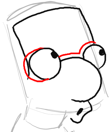 Millhouse wears glasses so now we will draw the frames. Draw a letter ‘c’ like shape on the left side of Millhouse’s left eye. Also draw a line that follows the same outline of the top of the nose and the top of the eye. Look at the picture above if you don’t understand what I am telling you to do.