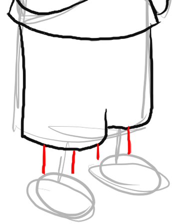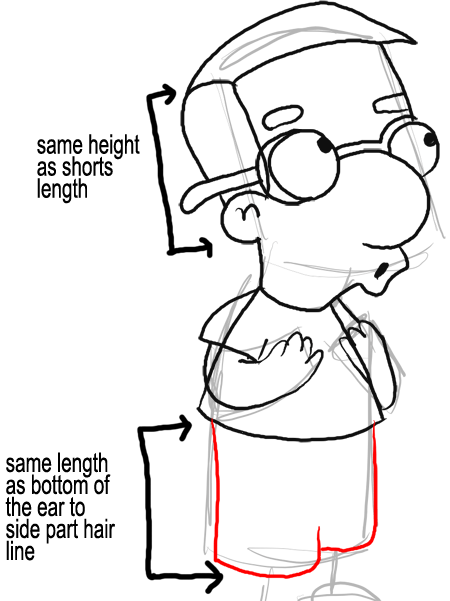 Again, I’m trying to show you proportions…Millhouse’s shorts are the same height as the bottom of Millhouse’s left ear to his hair part. Draw the shorts as a number ‘3’ like shape (sideways).