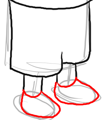Now draw Millhouse’s shoes. by drawing a sideways ‘j’ like shape on the bottom and a number ‘4’ like shape on the top right of each shoe.