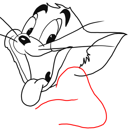 Now draw Tom’s tongue by drawing an oval (but don’t finish closing it at the top right of it) that at the top looks like an ‘m’. Also draw the back of Tom’s through which looks like a lima bean.