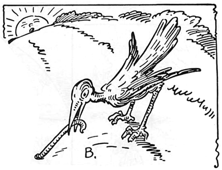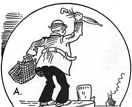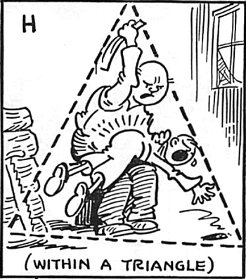 In grouping comic figures or objects, some general form, such as a circle or a triangle (as illustrated in examples G and H) often will suggest itself as an invisible boundary or frame where the subjects are placed. The picture of the belated traveler (pictured below) who has missed his train has been drawn without any explanatory lines and is analyzed in the diagrams 1, 2, and 3 at the bottom of this page. Study them carefully and note how the rules that we have outlined here have been followed.