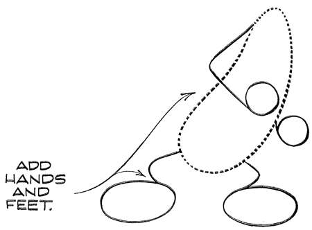 The draw the hands and feet. The hands are circles and the feet are ovals. Connect them to the body with lines. Remember that the lines should bend at the knee, unless standing straight. Remember that the arms bend at the elbow, unless arm is straight out.
