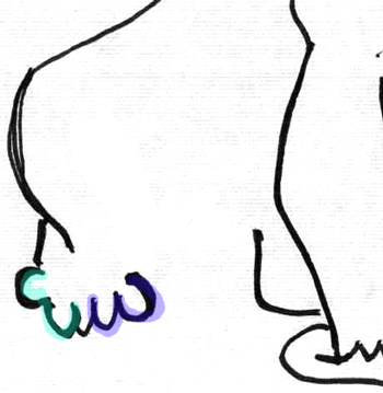 Now for the back foot, draw a backwards number 3 (highlighted in aqua) followed by a letter ‘w’ shape (highlighted in purple).