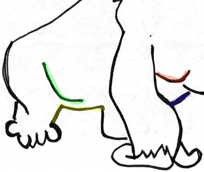 Now for finishing touches. Draw a sideways letter ‘L’ (highlighted in yellow) above the back foot. Draw another letter ‘L’ shape (highlighted in green) above the yellow one. On the right side of the left arm draw a backwards ‘L’ shape (highlighted in red) and a sideways letter ‘T’ shape.