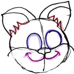 Draw the ovals (highlighted in purple) for eyes. Draw the hamster’s mouse (highlighted in pink) by drawing 2 sideways letter ‘J’s. Draw the hair that is within the hamster’s ears as zig-zaggy letter ‘M’ like shapes.