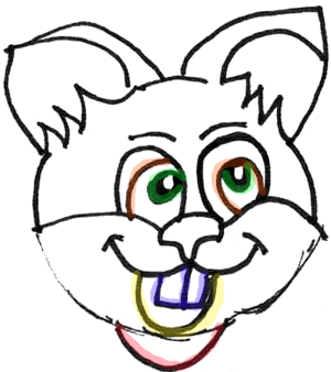 Draw oval shapes inside the eyes. draw another oval shape within that oval…fill it in except for a spot for the highlight of the eye. Draw a letter ‘u’ like shape under the smile (highlighted in yellow) for the open mouth. Draw the hamster’s teeth as a sideways capital letter ‘E’ (highlighted in purple). Draw a letter ‘u’ like shape under the face (highlighted in pink) for the hamster’s chin.