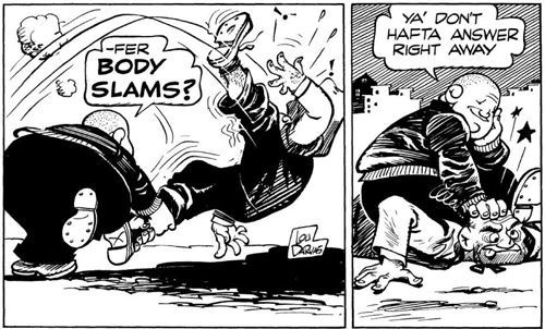 Now lets look at comic strip (B). Compare it with Comic Strip (A). Notice where, and how the shading was applied. Notice the action lines in the second panel which denotes shaking of the leg…notice the lines of motion in panel three and the leathery appearance of Haff Nelson’s Jacket – his pants are solid black which makes him a stand out – after “coloring” the clothes, the strip is completed with ground and background shadows.