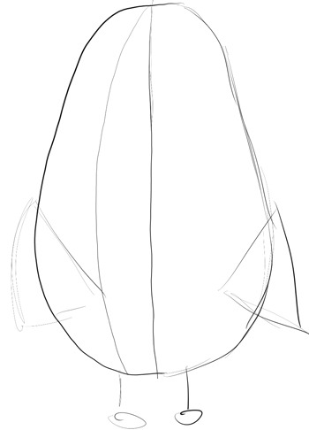 Start off the drawing of Mrs. Puff by simply drawing the basic shapes that make up her form. For example, the shape of her body is the shape of a lima bean (an oval that is wider at the bottom and narrower at the top). Then near the bottom, draw triangles (fins) that turn inwards. Draw a vertical line down the center of Mrs. Puff (for a guideline), then draw another guideline between the center line that you drew and the left edge of Mrs. Puff’s body.