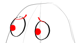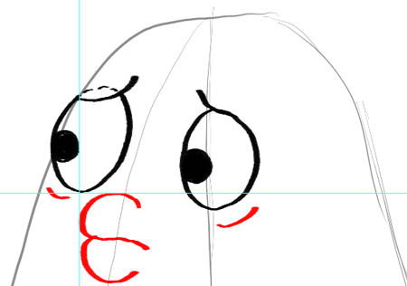 Draw Mrs. Puff’s eyes by drawing 2 ovals … one on the vertical center line that you drew in step #1. I drew blue guidelines just to show you that Mrs. Puff’s left eye is higher than the eye on the right. You don’t need to draw the guidelines if you don’t feel that you need to.