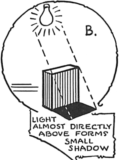 Shadows are dark tones which result from some object being in the direct path of light, while shading in a drawing represents the tones on an object that vary from dark to light according to the way the light strikes it. Though comic pictures seldom need any elaborate use of shadows, the forms of figures and objects are brought out effectively by shadows if drawn correctly.