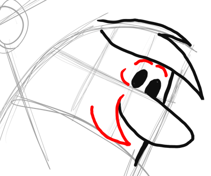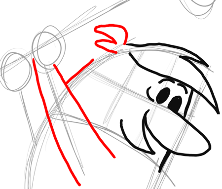 Draw Barney’s nose, a letter ‘u’ shape. Notice where on the face’s grid to place it. Also draw Barney’s hair … notice that it looks like a sideways letter ‘W’.