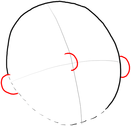 Now that you drew guidelines, it will be easier to place the nose and ears…place the nose (a backwards letter ‘c’ shape) in the center of the face. Draw the ears (letter ‘c’ shapes) on both sides of the horizontal line (line going left and right).