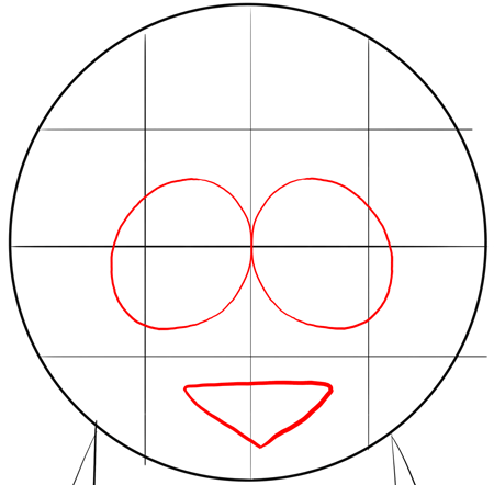Now let the guide lines help you find where to place the eyes. Draw an oval for each eye. Also draw Kyle’s mouth by drawing an upside down triangle-like shape.