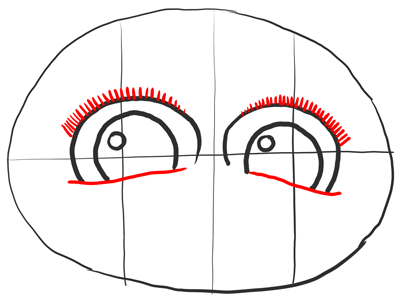 Now draw multiple small lines all along the top of both eye. Draw a line under each eye, as seen above.