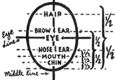Now separate the point between the nose and the bottom of the oval into 3 equal parts (or in other words, into thirds). The top line is the nose line. The next line is the mouth line. The last line is the chin line.