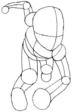Draw stick guides for his legs and arms. His left leg guide is short because its far away from the viewer.