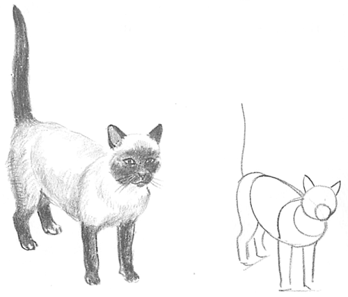 A cat has very much the same framework as a dog, but its back is usally longer. Look at the proportions of your cat and think about the size of its head, the length of its neck, the difference between front and back legs, etc. When you begin to sketch, don’t forget to draw the simple shapes very lightly – they are only put in to help you!