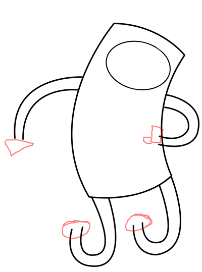 Lightly sketch an oval on each foot, a triangle on the left hand, and 2 rectangles on the right hand.