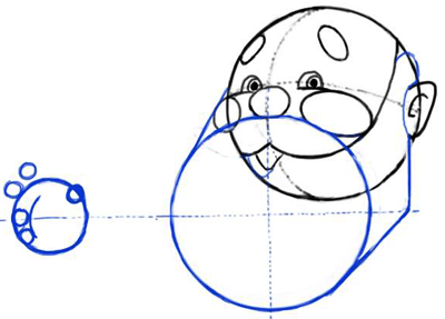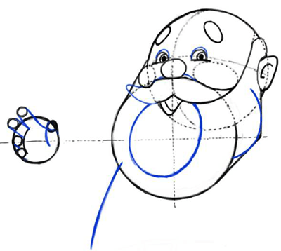 Step 5) Right below the nose draw another circle of the same size as the head’s – that is for the beard. Mark a horizontal line through the center of the new circle. On the left from the circle draw a smaller circle placed on the same horizontal line for the hand. Then draw five small circles around and inside that circle for the fingers. Draw a vertical line starting right below the ear – stoop at crossing with the marked horizontal line you drew for the beard, then join it with the “beard-circle” .