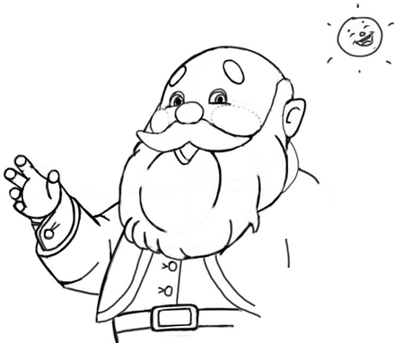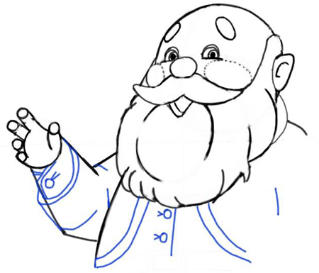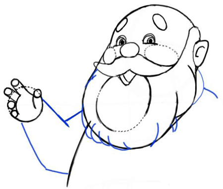 Step 6) Continue with the eyes, add more detail to the beard and the hand, draw mustaches, draw a line for the body. Erase all auxiliary lines and marks to clean up.