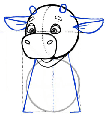 Step 4) continue with the head and draw horns and ears. Then, draw two lines for the legs, they should be one calf’s head long (see the picture)