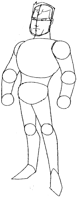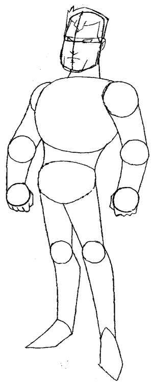 Start off by making a simple ball and stick figure to establish a pose. Feel free to pose your character any way you want. Its important that the chest will be the largest circle, followed by the pelvis, the head, the shoulders, and the hands being the smallest circle. Remember that giving your character a large chest makes him look “heroic”.