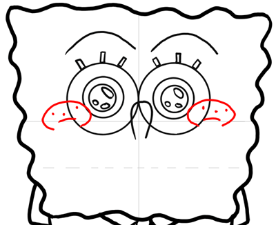 Draw another guideline half way down on the lower half of Spongebob’s face. Draw ovals for his craters. Draw the fingers – on the left hand, draw a letter ‘s’ shape…on the right hand draw an upside down question mark shape.