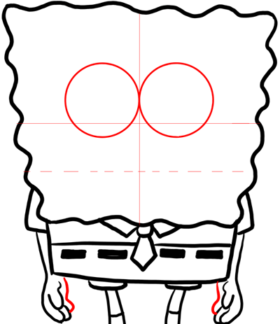 Now its time to draw Spongebob Squarepants’ tie by drawing an open-at-the-top circle and the 2 outward slanted lines connected by a letter ‘V’ like shape. Also draw Spongebob’s pants by drawing a rectangle like shape below the squiggly lines that you drew in step #2. Also draw the pants legs.