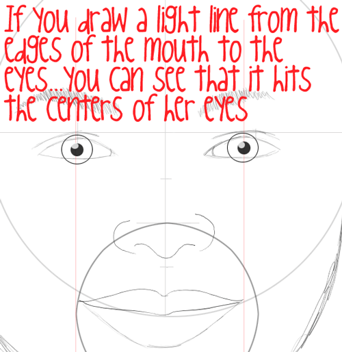 Now draw the eyes….notice that to space the eyes evenly, one eye fits in between them. Miranda has very squinty-like eyes.