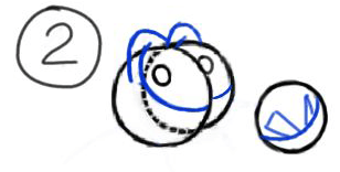 Step 1) Draw two circles for the eyes and one smaller for the nose. Add irises to the eye-balls.