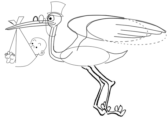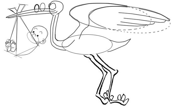 Darken lines…add some feathers and shading and you have a pretty nice looking stork and baby cartoon.