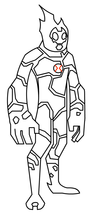 Today we will show you how to draw Heatblast from Ben 10. He is a magma-based life-form that can control fire at will, either projecting it in a wide range of forms or absorbing it into himself. He can fire streams of flame, create fireballs, manifest tornadoes of flame, utilize said tornadoes to carry himself and others short distances, and radiate heat in all directions for a localized explosion. Look below for the easy-to-follow illustrated steps to drawing Heatblast. Have fun.