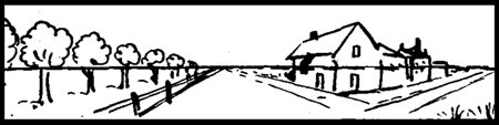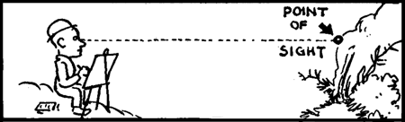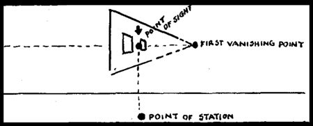 Each Vanishing Point Determined by Point of Station. – The point of station is somewhere in front of the landscape or picture, and is, in fact, the eye of the viewer. The distance of the viewer should be at a distance less than the front dimensions of the scene to be enclosed in the picture. That is to say, if the front line of the scene to appear in the picture was one hundred feet wide, the artist should not be stationed more than one hundred feet from the nearest object that appears in the picture. He may, and in most instances should, however, be stationed much nearer.