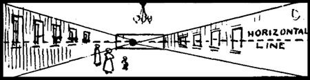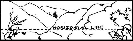 (2) The Horizon Line is a line parallel with the top and bottom of the picture drawn through the point of sight. The distance between the top and bottom of the picture, at which the horizon line is drawn is determined by the point of sight. If the point of sight is high, the horizon line will be correspondingly high. All actual horizontal lines (not parallel from right to left) above the horizon line are inclined toward it. Every receding line of the same kind that is below will run up to the horizon line. The vanishing points, with few exceptions, lie on the horizon line and are independent of the point of sight.