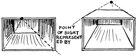 A large box, open at one end, has its front and back lines in parallel perspective if the opening is parallel with the body of the viewer as he faces it, while the lines of the sides, top and bottom, recede directly from him. In this case, the point of sight becomes the vanishing point, because all the straight lines receding from the sight converge (come together) on this point.