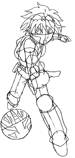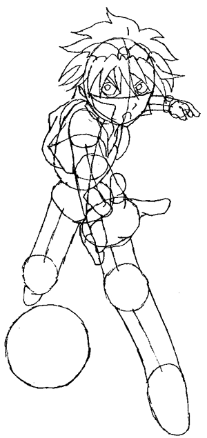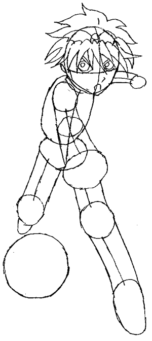 4) Add some leg guides and fill the arms and legs with muscle. Also draw a circle for the Bakugan that he’s throwing forward.