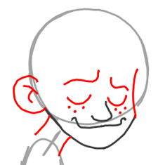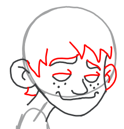 Draw a letter ‘c’ for the ear and a backwards letter ‘J’ inside of it. Draw a curved line for each eye. Draw 3 dots on each cheek for freckles. Draw his eye brows (the one on the right is a sideways letter ‘s’) and the side of his face.