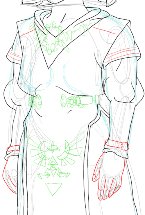 Draw her hands using the shapes that you drew in the previous steps. Also draw the basic shapes that make up the patterns that you see on her dress (if you don’t know how to draw the actual shapes…otherwise just go right ahead and draw the shapes outright.)