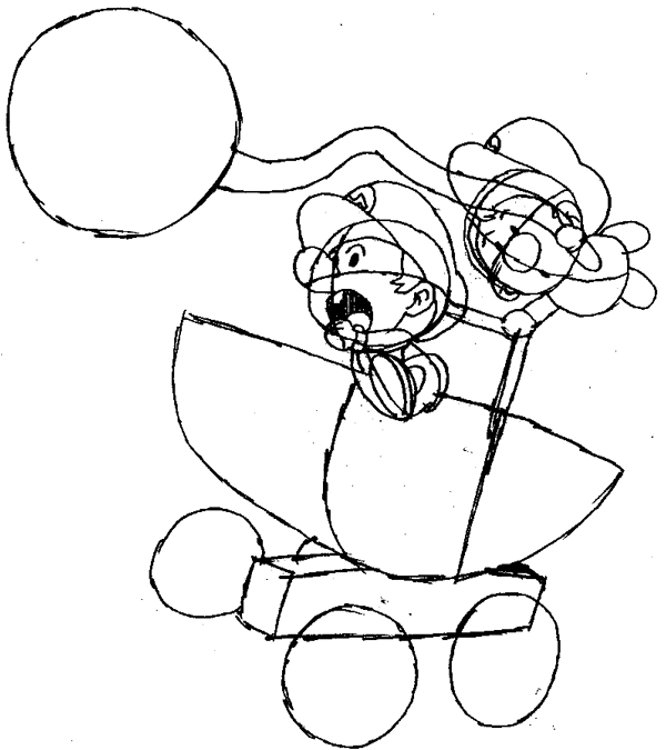 Start the outline for the baby carriage. A half oval sitting underneath the brothers.