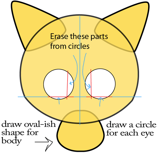 Draw guide lines for the face (showed by the blue line). Draw two circles for the eyes using the lines as guides. Erase the parts from the eyes as shown with the red lines. Draw an oval-ish shape for the body.