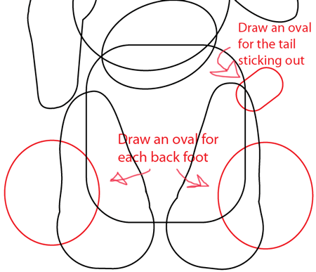 Draw two ovals, one for each back foot and draw an ovals for the tail.