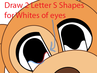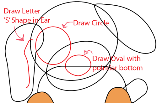 Draw a letter S shape in the ear. Draw a circle for left eye placement and also draw an oval with a pointier bottom.