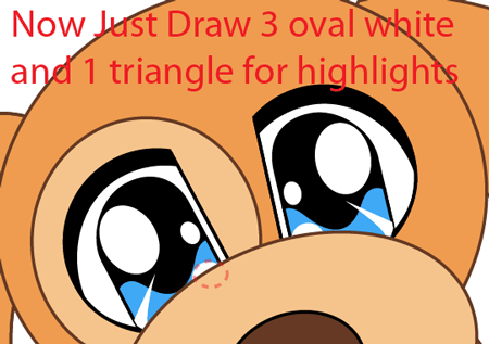 Draw each of the outer eye by drawing a circle and then draw a line on the inner part of the eye. As you can see it is also partially hidden by the snout of the doggy.