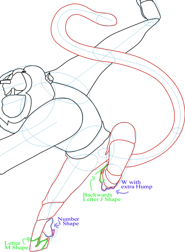 Draw tail and feet contour. Again, see the shapes that are within the more complicated shapes.