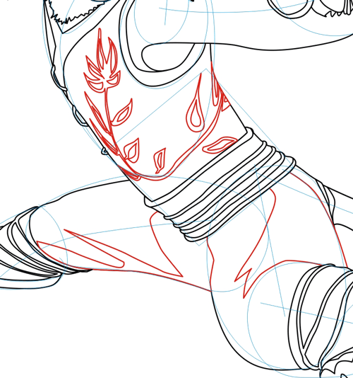 Next, start drawing clothing details…notice the flowers on the vest…these can be built up with tear drop shapes and moon shapes and lines.