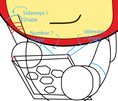 Draw a rectangle within the two hands and draw another oval, a bit smaller, and further to the right. Then draw five hexagons within the rectangle.