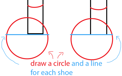 Draw two curves for his socks and also draw a circle and a line for each shoe.